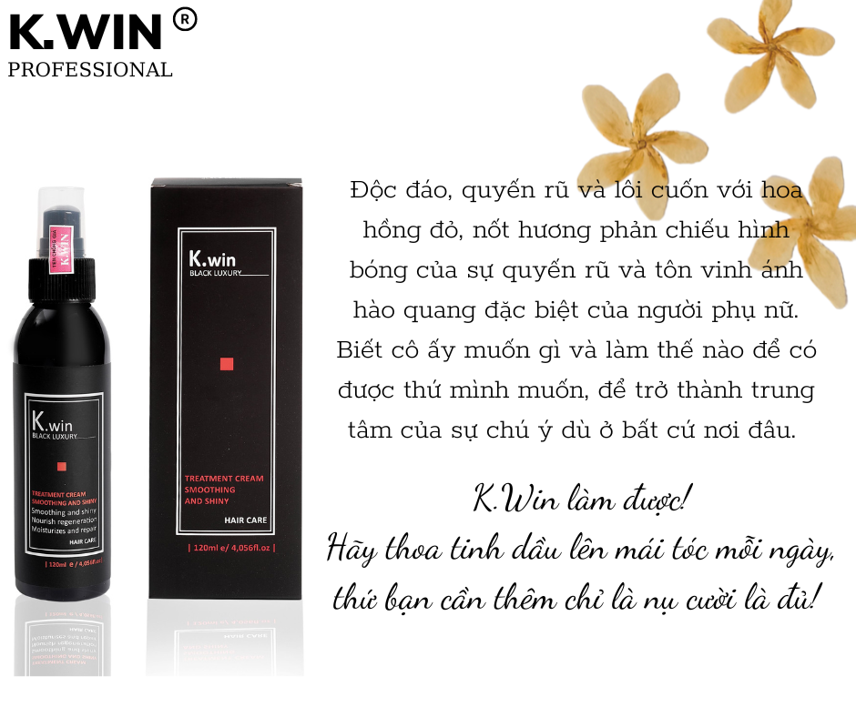 Tinh dầu dưỡng tóc K.Win là sản phẩm nổi bật trong thị trường “mỹ phẩm tóc” hiện nay. Tinh dầu K.Win có 2 loại là: Dạng Tinh dầu khô và tinh dầu nước. Hai sản phẩm này có đặc điểm chung là có hàm lượng dưỡng chất cao, phục hồi tóc hư tổn tốt, hương thơm giống nhau và bảo vệ tóc hoàn hảo khỏi những tác nhân gây hại từ môi trường bên ngoài.